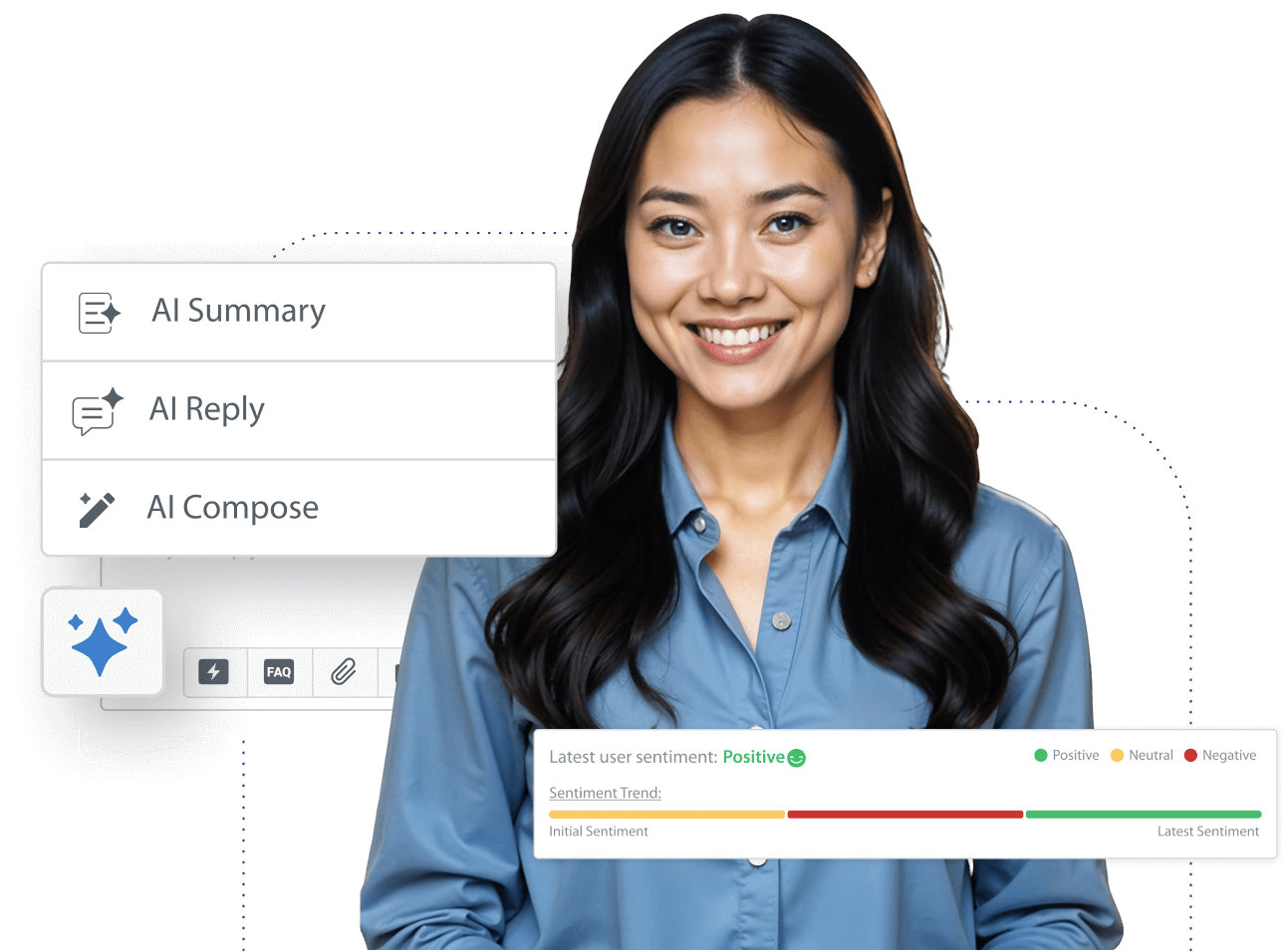 AI Reply suggests context-aware responses, speeding up resolution times while ensuring accuracy and consistency.