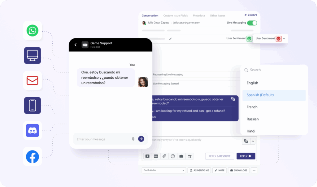 Helpshift’s Language AI builds this into the platform, letting your team respond in dozens of languages from the same workspace while preserving tone, context, and SLAs.
