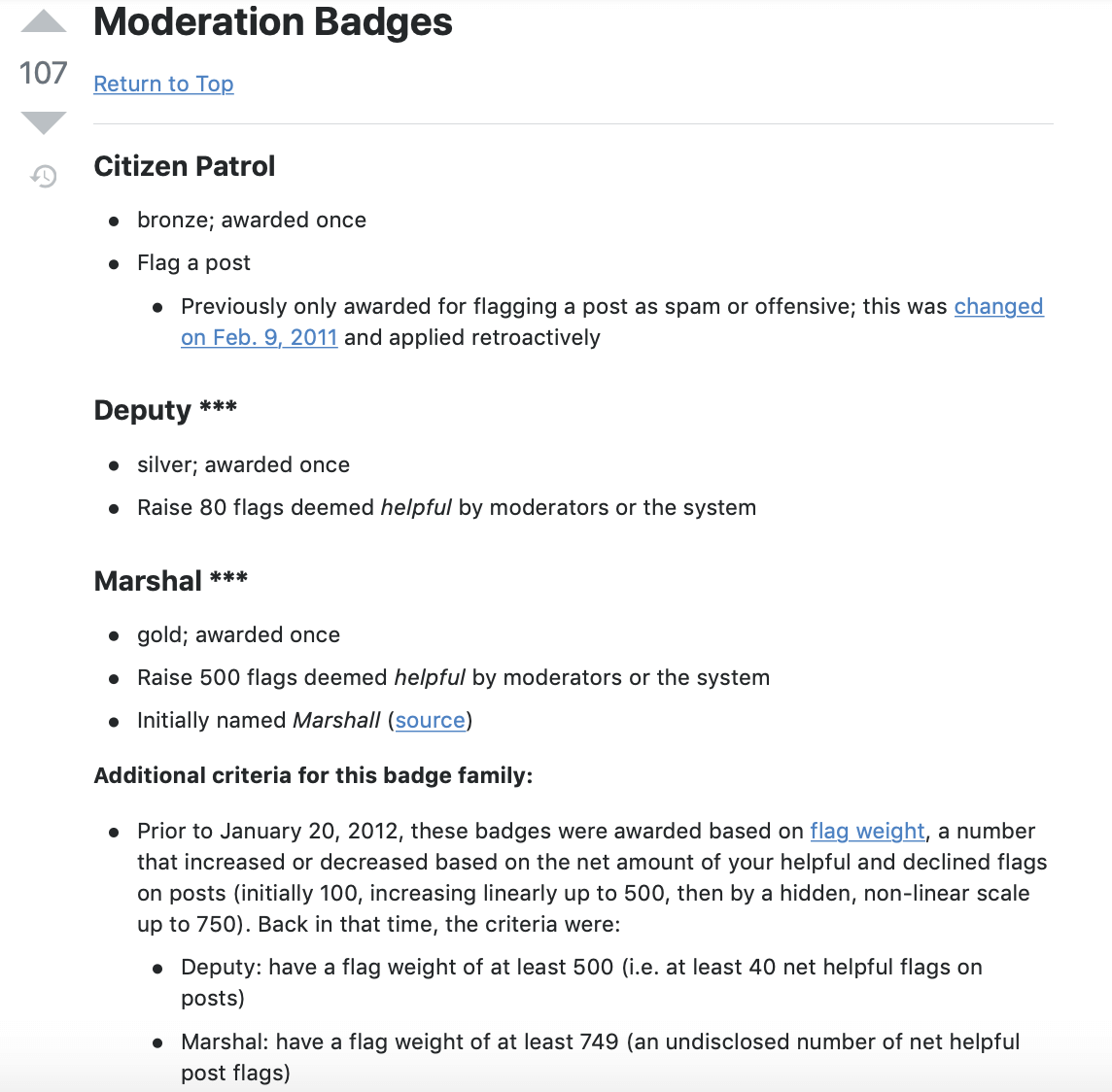 You can even integrate some gamification elements like badges for members who have moderated other community members and allow them to display their badges on their profiles. Stack Overflow community uses gamification elements in the form of badges that other members can earn for moderating content and contributing to discussions. They even created a whole list of moderation badges that community members can earn based on their contributions.