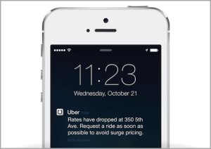 And here’s a notification by Uber informing the user about low prices in their whereabouts: