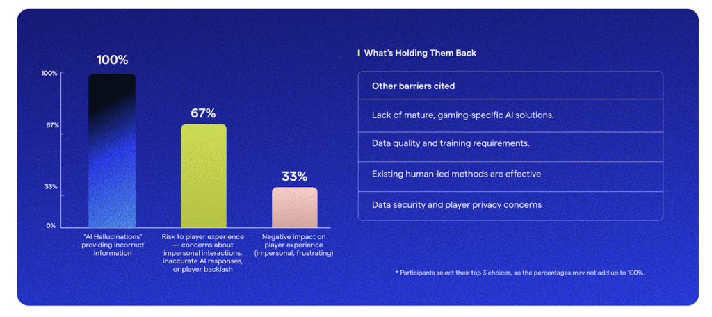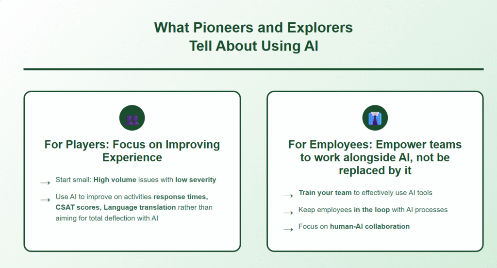 They’ll increase AI usage only when its reliability and accuracy are unconditionally proven. Many feel that player experience and ticket resolution still benefit from a human touch, reason enough not to disrupt the status quo.