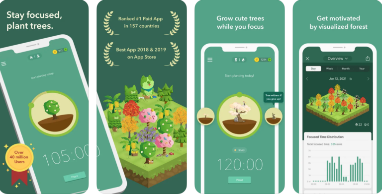 This gamification example app uses tree planting as the key gamification concept. It helps you stay focused on your tasks without distractions like social media. While you are working on a task, you “plant a seed” that may grow into a mighty tree. Or may not — if you succumb to temptation and interrupt the activity, the tree will wither. The more focused you are, the more trees you can grow, and eventually they can turn into a forest.