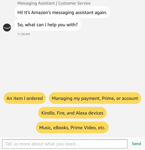 When first entering Amazon’s messaging experience, a bot immediately greets you and explains a bit about how you can interact with it. It also provides several options for the customer to tell it what their issue is about. Additionally, the customer can free-type to describe their issue, which is then analyzed by an AI to route their issue to the appropriate bot or agent.