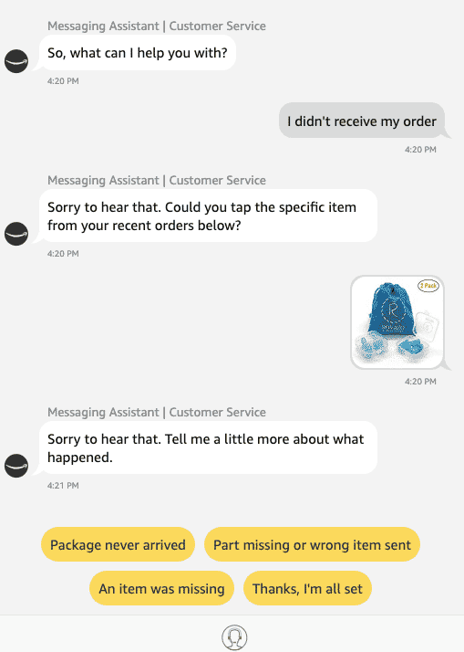 While this query seems like it’s similar to ‘where is my order?’ Amazon’s AI actually treated the query slightly differently, apparently understanding the slight nuance of asking ‘where’ to saying something wasn’t received. In this case, the bot returns options based on missing or damaged items. Ostensibly, this is because Amazon often packages different items together, so if a customer didn’t ‘receive’ an item it may be that it wasn’t in the box with other items.