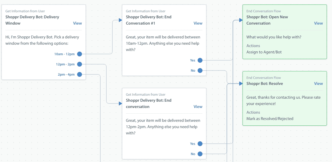 No code required – The Helpshift Bot Builder is very intuitive to understand in a left to right graphical interface. At no point does a user need to write any code.