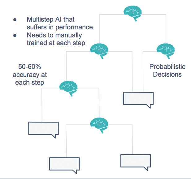 There is a huge flaw to this approach. Assuming that each bot step is modeled to yield an 80 percent probability of accurately understanding the user (an optimistic scenario), just two such steps in succession will yield only a 64 percent expected probability of working. A more commonplace scenario is 60 percent accuracy per step, resulting in a suboptimal 36 percent overall accuracy for a simple, two-step bot use case.