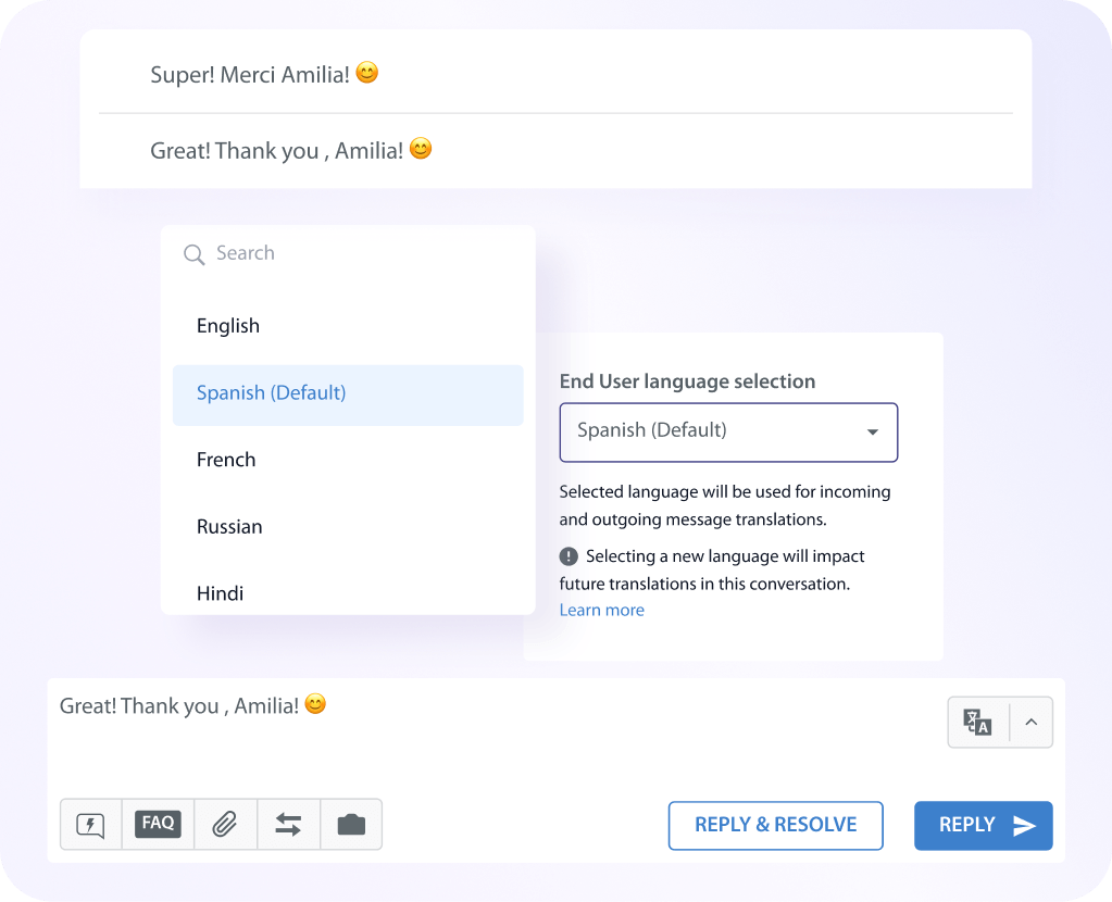 Language is another bottleneck. Localizing articles and assigning bilingual agents helps temporarily, but it doesn’t scale. Helpshift’s Language AI detects the player’s language and translates conversations in real time, keeping global support personal without hiring separate regional teams.