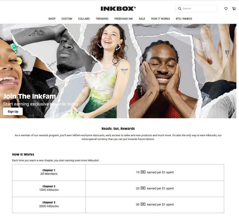 Inkbox is a Canadian company that produces and sells temporary tattoos. Members of its online community, Inkfam, can earn rewards called Inkbucks for each particular amount of money spent on temporary tattoos. The loyalty program is divided into three ”chapters”, and the reward grows with each “chapter.” Community members can then redeem their Inkbucks on various prizes, such as discount coupons and tattoo moisturizers.